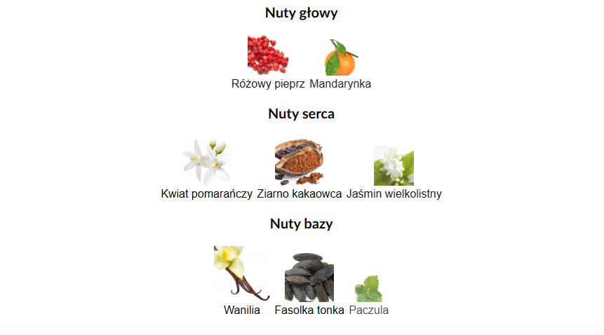 - Nuty serca: Kwiat pomarańczy, Ziarno kakaowca, Jaśmin wielkolistny